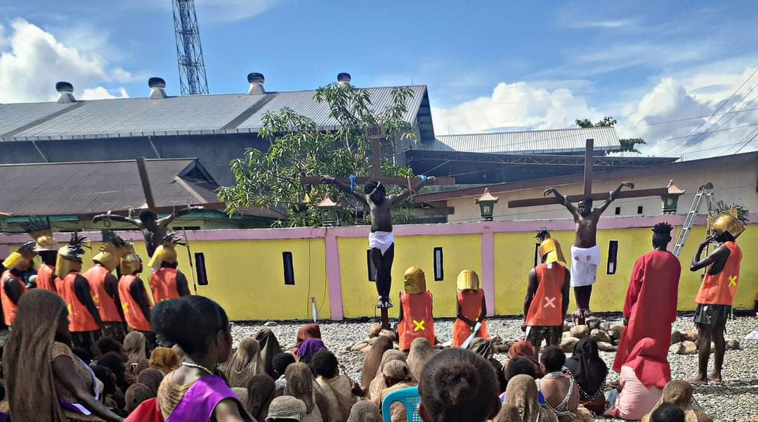 TIMIKA orang muda/mudi katolik (omk) kapela tillemans melakukan jalan salib hidup diperarakan lokasi kapela tillemans hati kudus yesus (emaa owaa) timika pada jumad 02/04/2021.